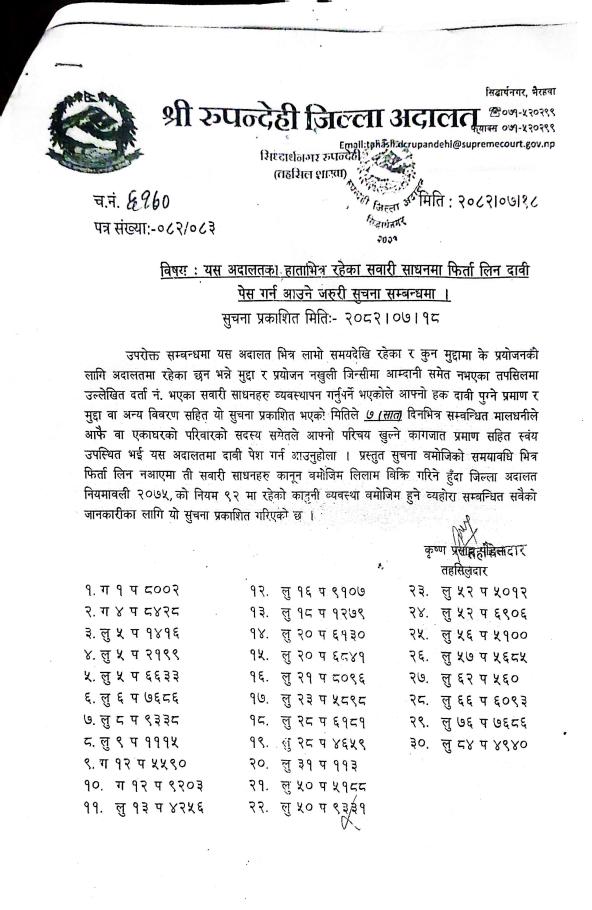अदालतका हाताभित्र रहेका सवारी साधनमा फिर्ता लिन दाबी पेश गर्न आउन सम्बन्धी जरुरी सूचना
