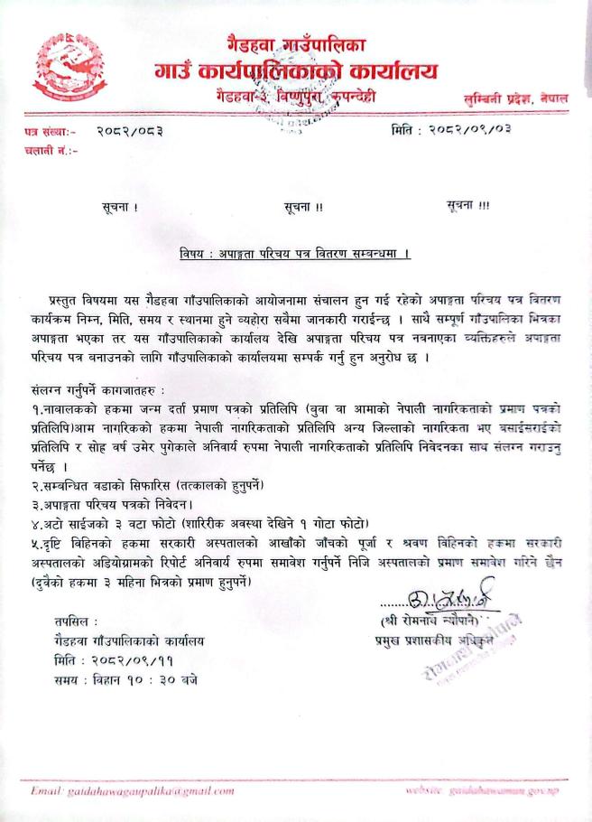 अपाङ्गता परिचयपत्र वितरण सम्बन्धमा ।