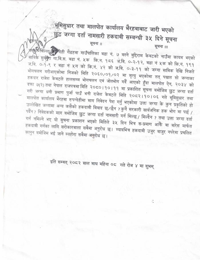 भूमिसुधार तथा मालपोत कार्यालय भैरहवाबाट जारी भएको छुट जग्गा दर्ता नामसारी हकदावी सम्बन्धी ३५ दिने सूचना ।
