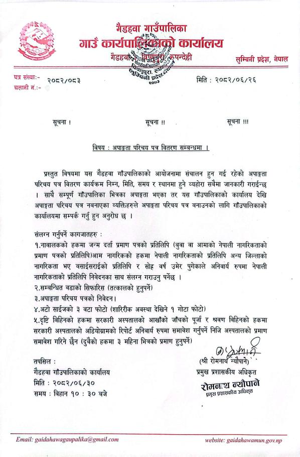 अपाङ्गता परिचयपत्र वितरण सम्बन्धमा ।