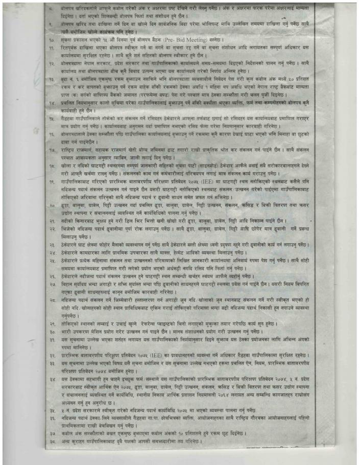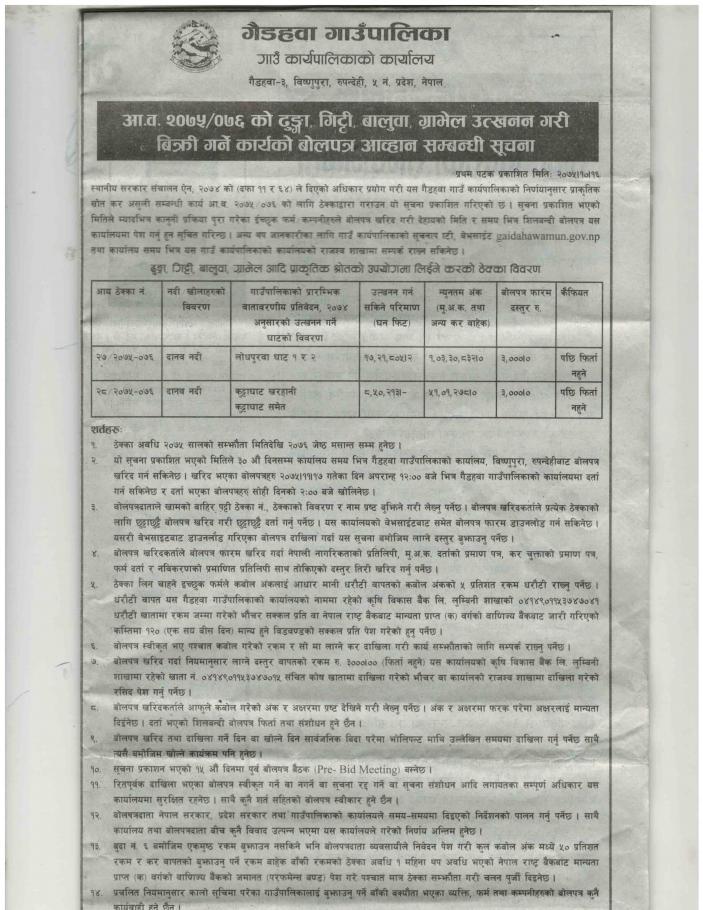आ.व ०७५/०७६ को ढुंगा, गिट्टी, बालुवा, ग्रावेल उत्खनन् गरि बिक्रि गर्ने कार्यको बोलपत्र आव्हान सम्बन्धी सूचना