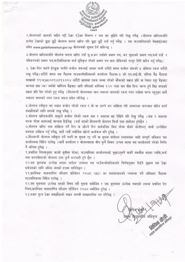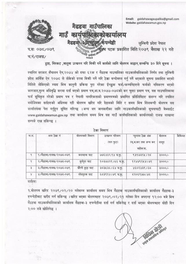 ढुङ्गा,मिस्कट, बालुवा उत्खनन गरि बिक्री गर्ने कार्यको वोलपत्र आह्रान सम्बन्धी सूचना