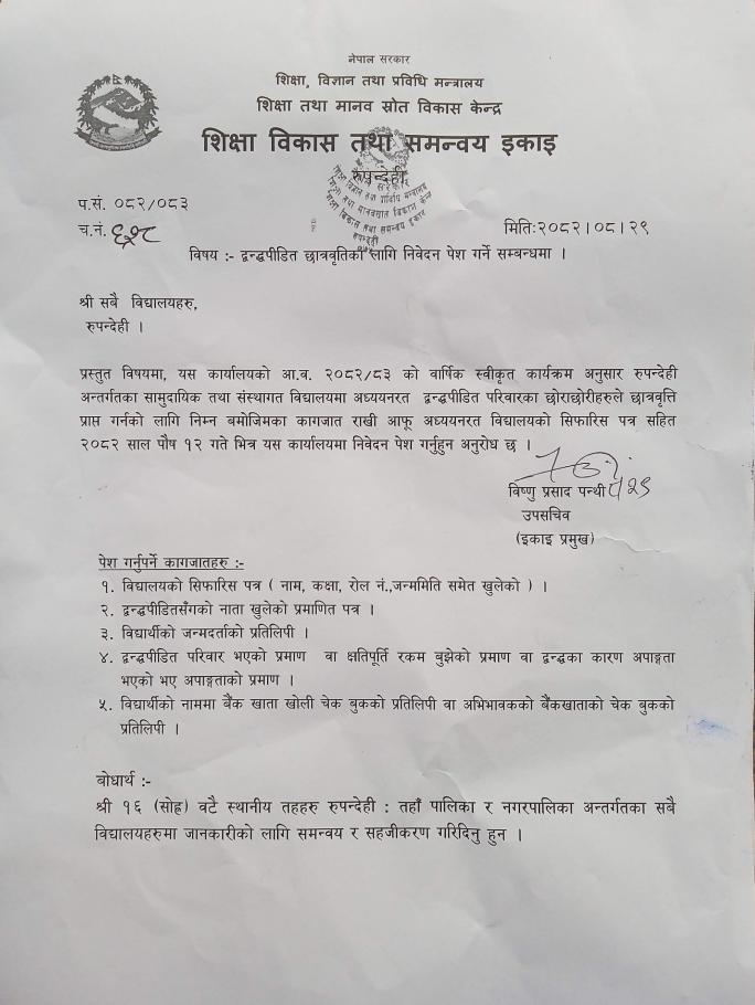 द्वन्द्वपीडित छात्रवृत्तिका लागि निवेदन पेश गर्ने सम्बन्धमा ।