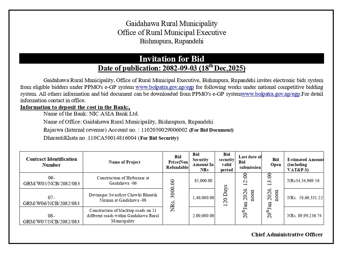 बाेलपत्र आह्वान सम्बन्धी सूचना ।