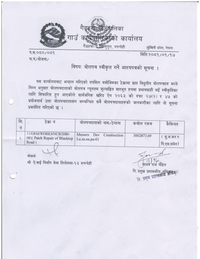 बोलपत्र स्वीकृत गर्ने आश्यपत्र सम्बन्धी सूचना।