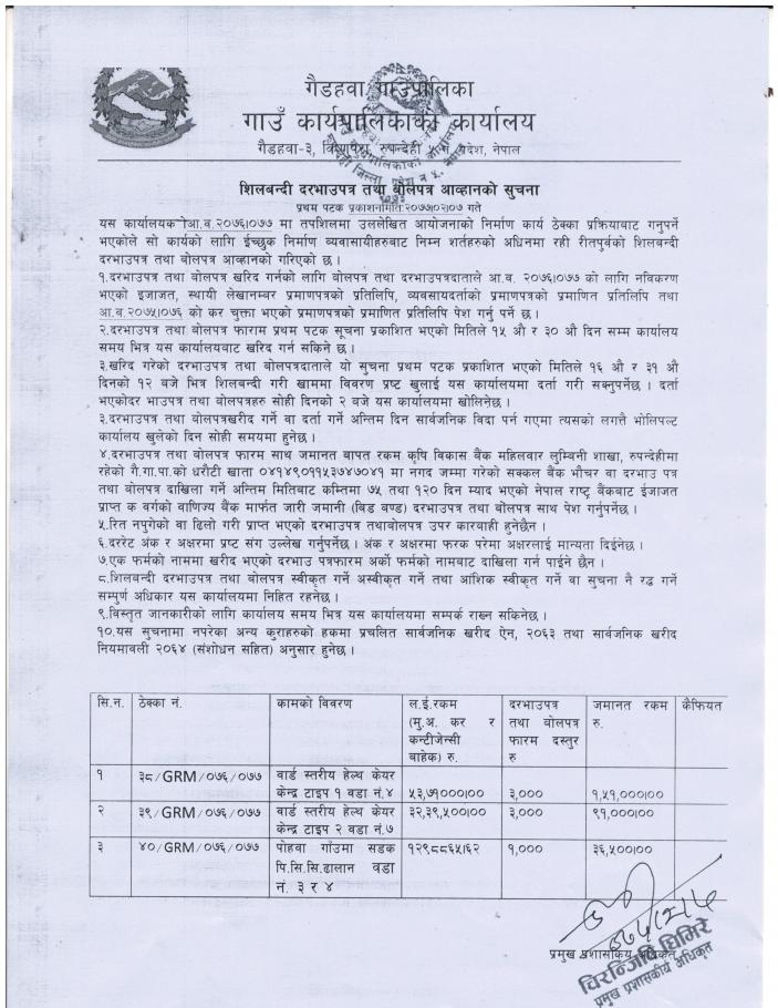शिलबन्दी दरभाउपत्र तथा बोलपत्र आव्हान सम्बन्धि सूचना