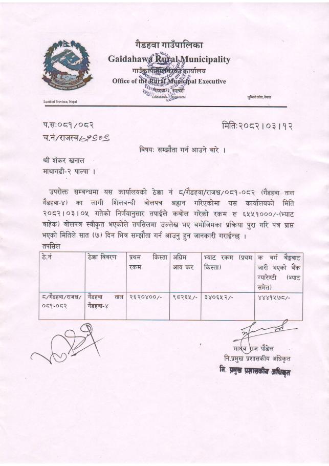 सम्झौता गर्न आउने बारे ।(ठेक्का नं.८ गैडहवा ताल)