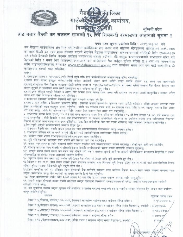 हाट बजार बैठकी कर संकलन सम्बन्धी १५ दिने शिलबन्दी दरभाउपत्र अह्वानको सूचना ।