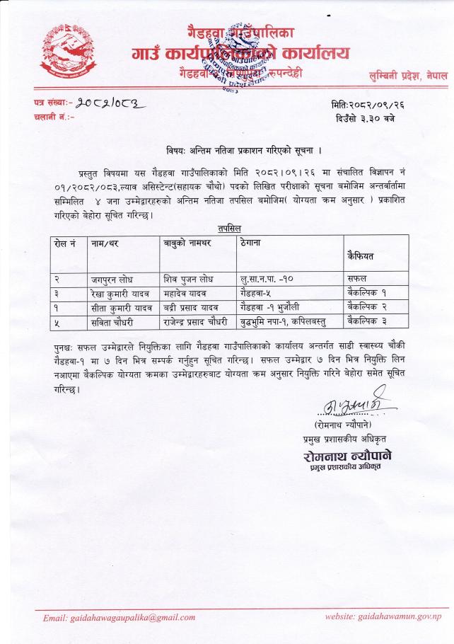 ल्याब असिस्टेन्ट(सहायक चौथो) पदको अन्तिम नतिजा प्रकाशन गरिएको सूचना ।