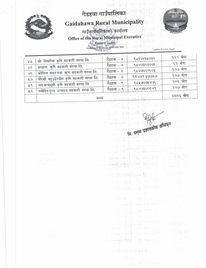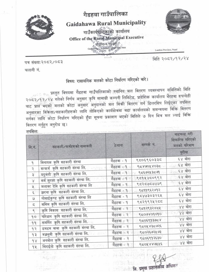 गैडहवा गाउँपालिका बिष्णुपुरा - ३, रुपन्देही इमेल - gaidahawagaupalika@gmail.com फेसबुक पेज - https://www.facebook.com/GaidahawaGaupalikaOfficial/ ट्वीटर पेज - https://twitter.com/HelloGaidahawa