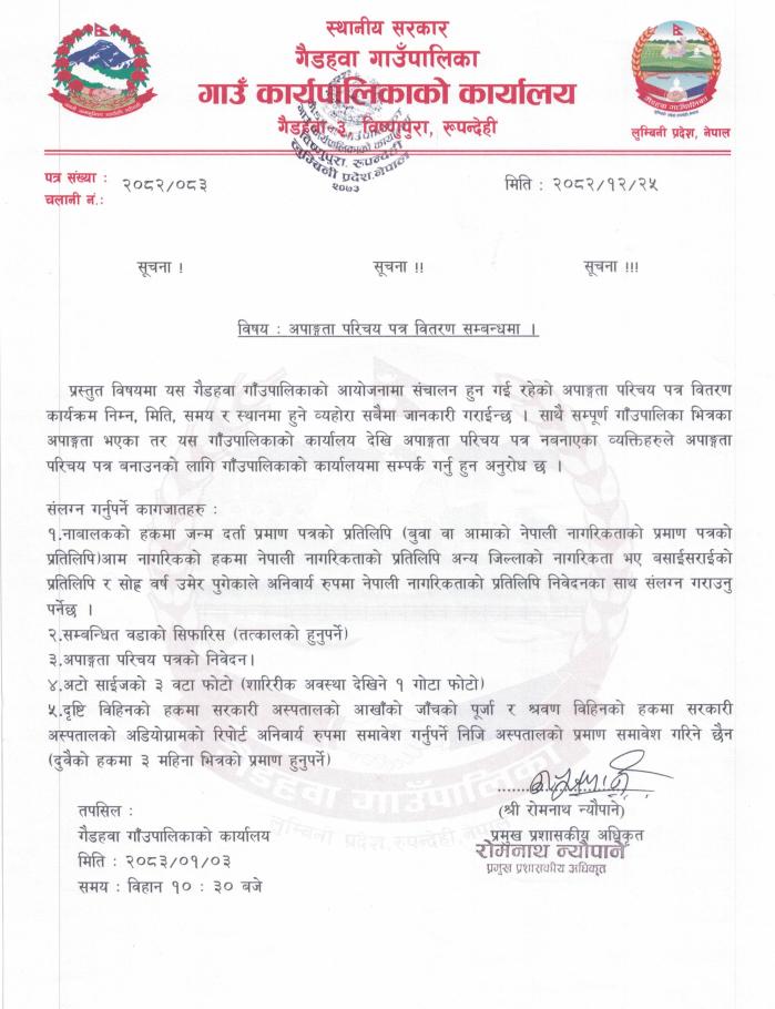 गैडहवा गाउँपालिका बिष्णुपुरा - ३, रुपन्देही इमेल - gaidahawagaupalika@gmail.com फेसबुक पेज - https://www.facebook.com/GaidahawaGaupalikaOfficial/ ट्वीटर पेज - https://twitter.com/HelloGaidahawa