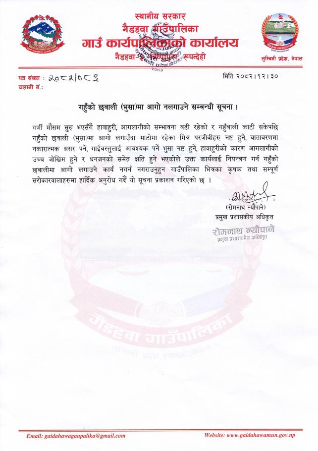 गैडहवा गाउँपालिका बिष्णुपुरा - ३, रुपन्देही इमेल - gaidahawagaupalika@gmail.com फेसबुक पेज - https://www.facebook.com/GaidahawaGaupalikaOfficial/ ट्वीटर पेज - https://twitter.com/HelloGaidahawa